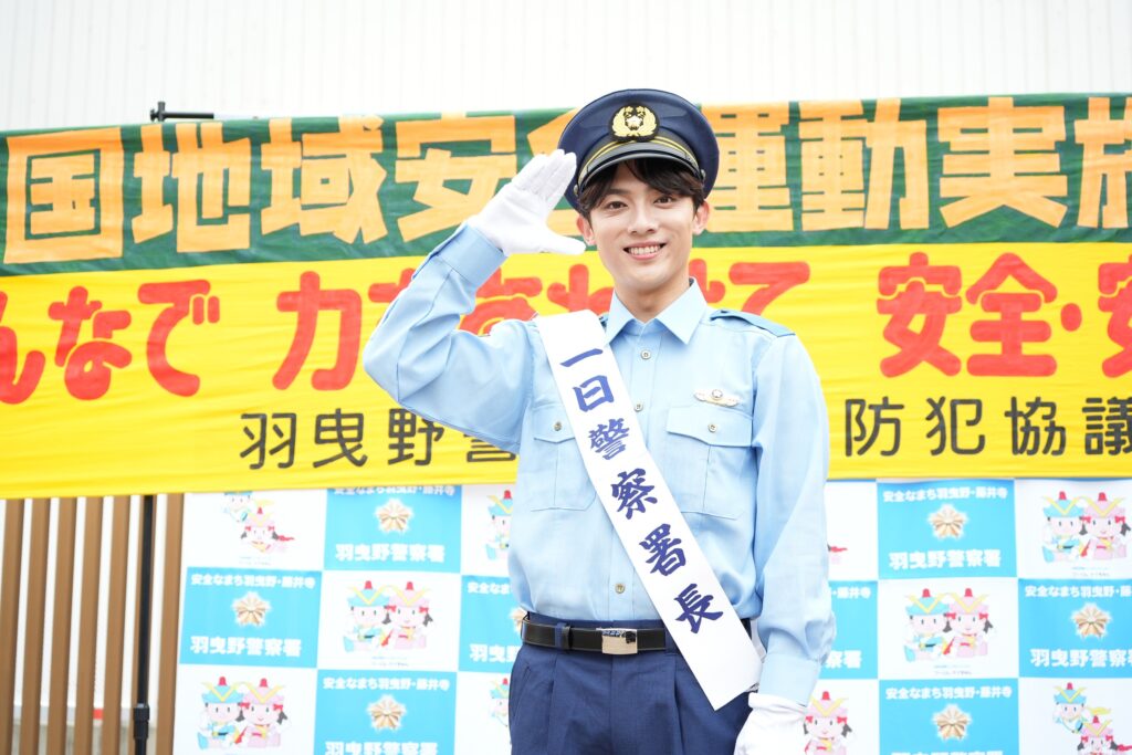 警察官姿で登場した辰巳ゆうとは、「今日は一日警察署長を通して、安心・安全な町づくりの為に少しでも力になれたらと思います」と挨拶。