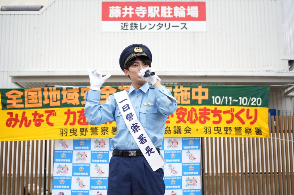 このイベントは、藤井寺市アンバサダーの辰巳ゆうとに一日警察署長を委嘱し、全国地域安全運動を盛り上げ、市民の防犯意識の高揚と地域全体で犯罪被害を防ぐという気運の醸成を図るため実施するもの。
