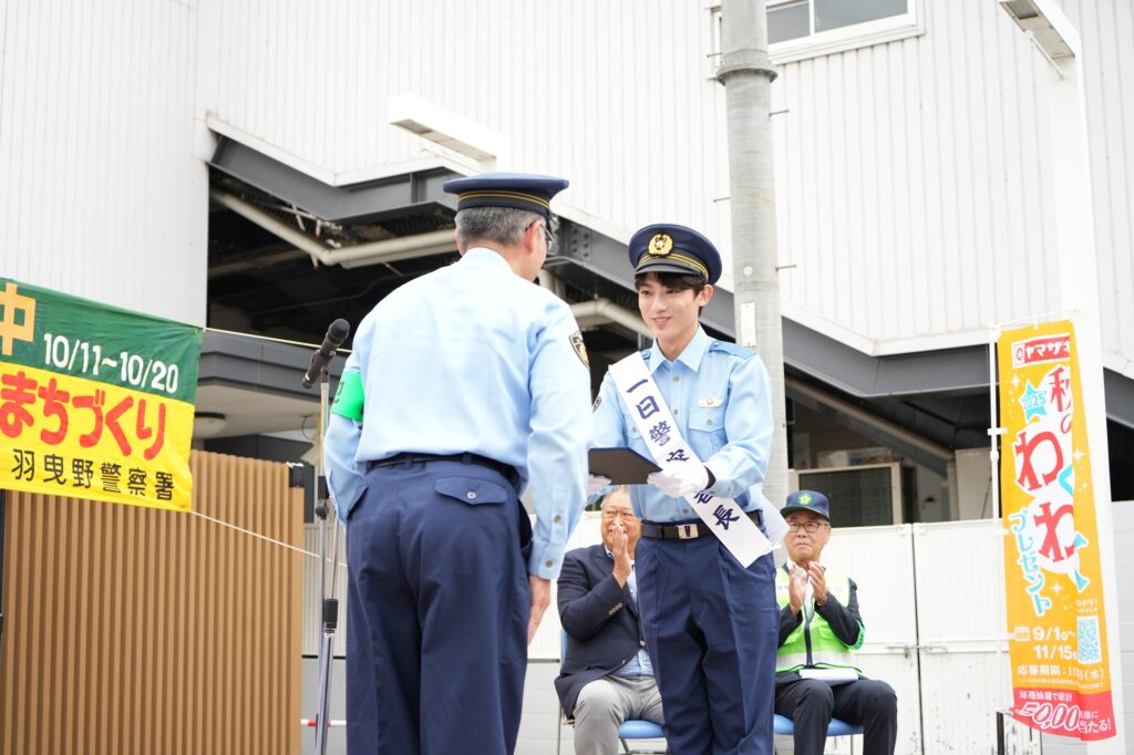 地福羽曳野警察署長から辰巳ゆうとに、一日警察署長を委嘱されると「こうして地元に帰ってきて一日警察署長をさせていただけるのはありがたいこと。一人一人が応援してくださって、このような貴重な機会をいただけたので、今日は僕自身も楽しみながら、皆さんと安心安全とは何なのかを一緒に学んでいけたらと思います」と話した。