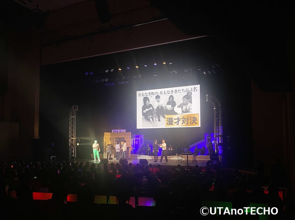 お芝居の中で、いろいろありつつ最終的に再開発推進派と反対派で漫才対決をすることになり…。