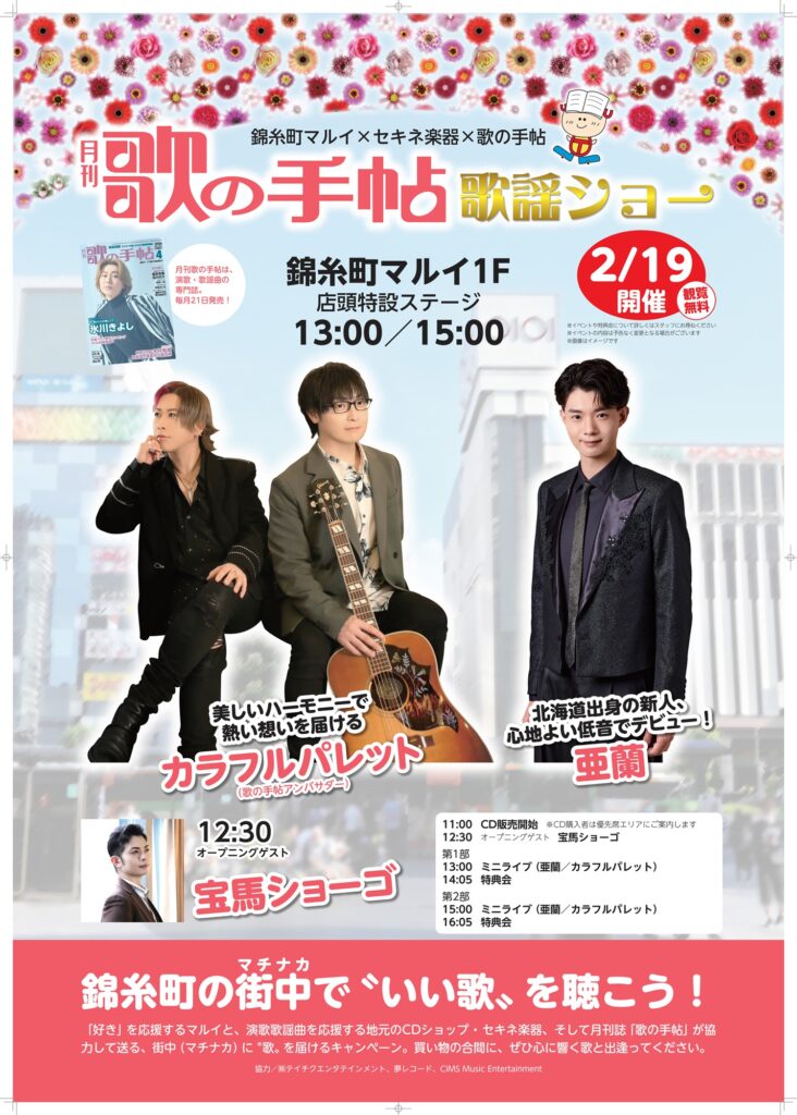 錦糸町駅前のマルイとセキネ楽器、そして歌の手帖が協力して行っている〝歌の手帖歌謡ショー〟が今月も2月19日(木)に開催します。