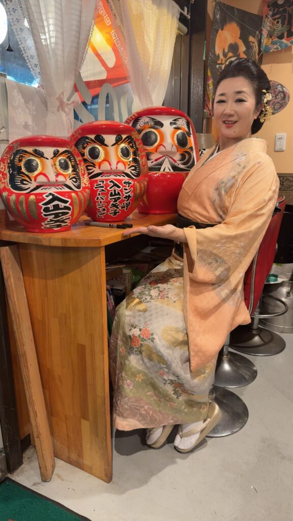 1月11日、渋川市後援会のお店「とり谷」での入山アキ子新春ショーから始まり、翌12日には高崎市の名所少林山達磨寺、高崎白衣観音を巡り、新年の抱負を込めた達磨(だるま)奉納も行った。
