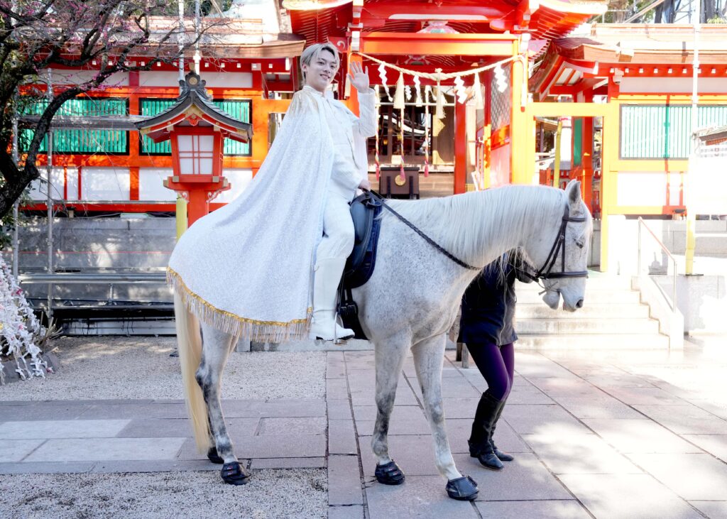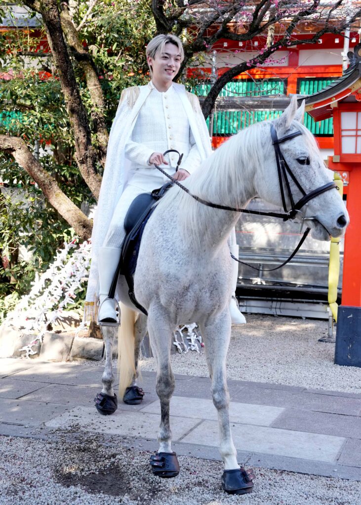 鎌倉時代末期の創建と伝えられる由緒ある神社でヒット祈願を行った辰巳は神妙な面持ちで神さまに手を合わせた後、この日のために誂えた王子さまさながらの真っ白な衣裳をまとって、千葉県の乗馬クラブからやって来た白馬=牝馬の「モモコ」(14歳)=にまたがり、境内に詰めかけた大勢の報道陣の前に登場。