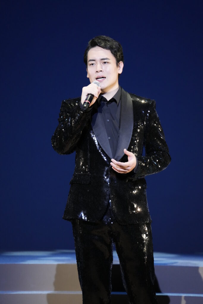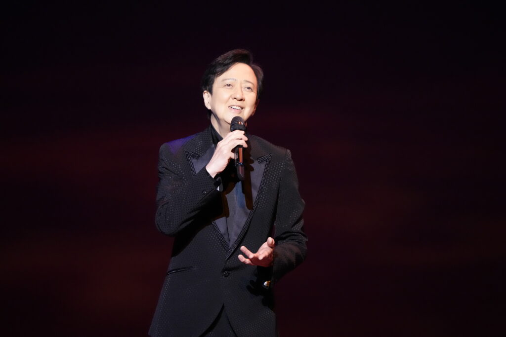 ▲幕開けは真っ白なスーツで星が瞬く中、『スターダスト』を歌唱。一気に別世界を作った木村徹二。写真は一幕目中盤のスタイル