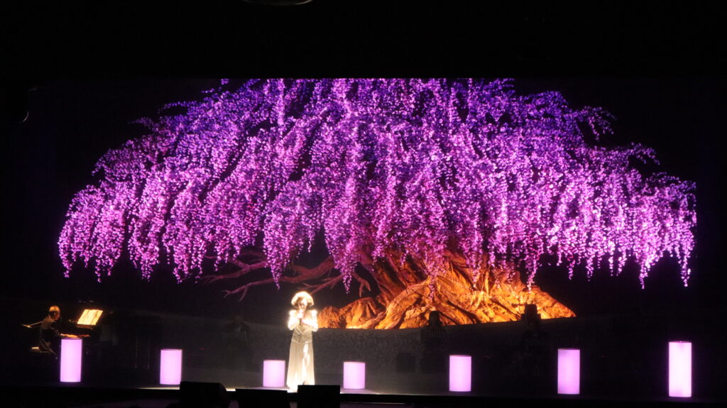 第一景の締めは、コンサートの定番曲『リサイタル』。自身初のヒット曲『女の港』が生まれるまで約20年、陽の当たらない活動が長く続いた大月ならではの想い、どんな場所でも今この瞬間を精一杯に、“誰かがどこかできっと聴いていてくれる…”そう信じて歩んできた自身のメッセージソングでもある曲を、たおやかに歌唱し第一景が終了。